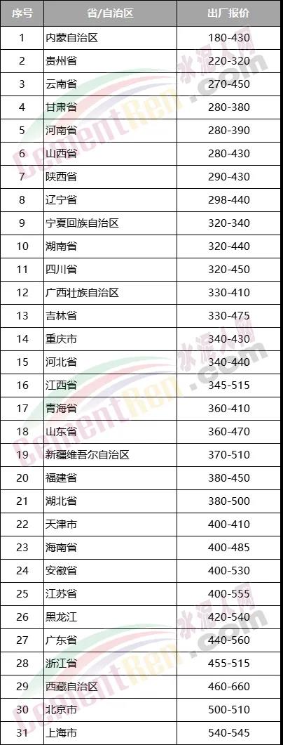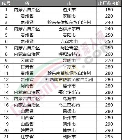 截止目前,水泥報(bào)價(jià)仍處于300元/噸以下的企業(yè)分布在甘肅省平?jīng)鍪小①F州省安順市、貴陽(yáng)市、六盤水市、黔東南苗族侗族自治州、黔南布依族苗族自治州、黔西南布依族苗族自治州;內(nèi)蒙古自治區(qū)阿拉善盟、巴彥淖爾市、包頭市、鄂爾多斯市、呼和浩特市、烏海市、烏蘭察布市;山西省呂梁市、朔州市、忻州市以及陜西省榆林市、云南省昆明市、河南省焦作市;遼寧省朝陽(yáng)市等20多個(gè)地區(qū)。