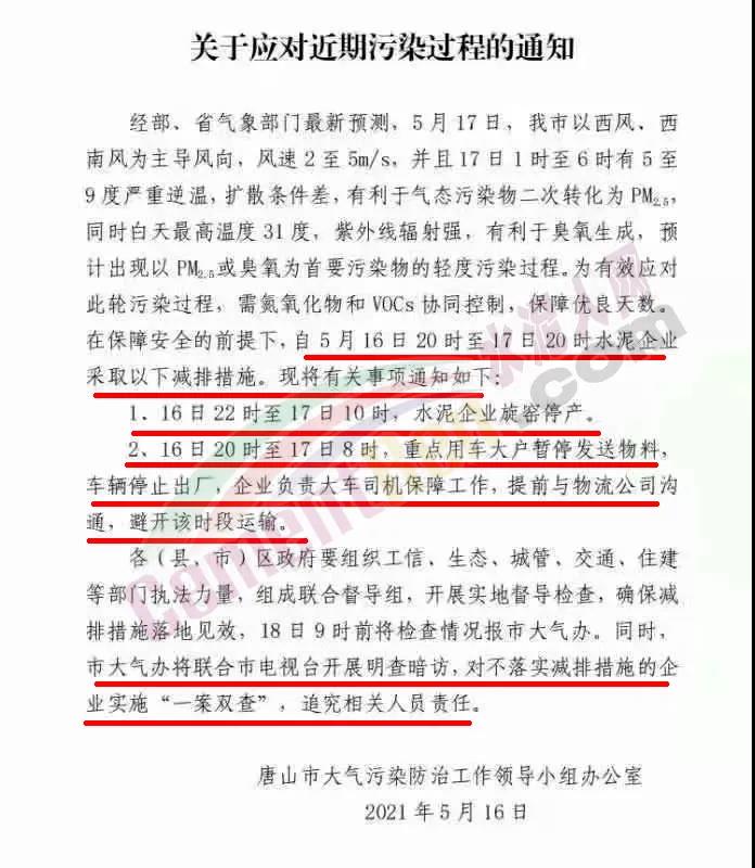 5月16日,唐山市發布《關于應對近期污染過程的通知》稱,自5月16 日 20時至 I7日 20時水泥企業采取減排措施。16日22 時至 17日10時,水泥企業旋窯停產。16 日20 時至17日8時,重點用車大戶暫停發送物料,車輛停止出廠,企業負責大車司機保障工作,提前與物流公司溝通,避開該時段運輸。