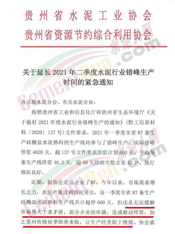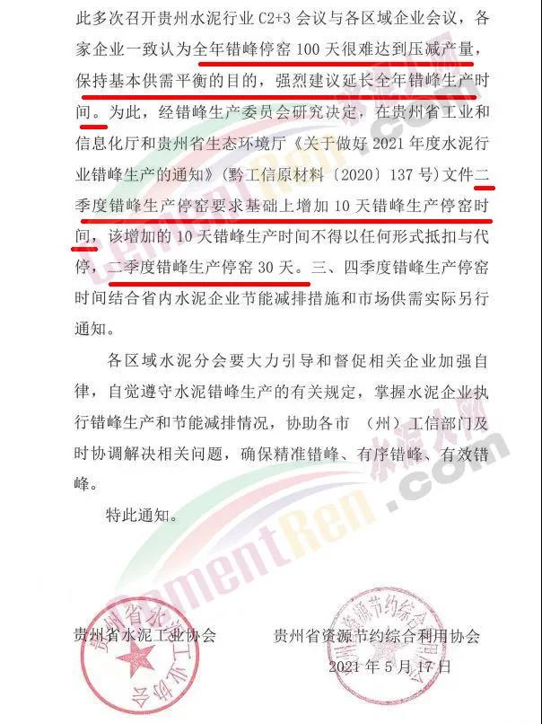 為此,經錯峰生產委員會研究決定,在貴州省工業和信息化廳和貴州省生態環境廳《關于做好2021年度水泥行業錯峰生產的通知》(黔工信原材料〔2020)137號)文件二季度錯峰生產停窯要求基礎上增加10天錯峰生產停密時間,該增加的10天錯峰生產時間不得以任何形式抵扣與代停,二季度錯峰生產停窯30天。