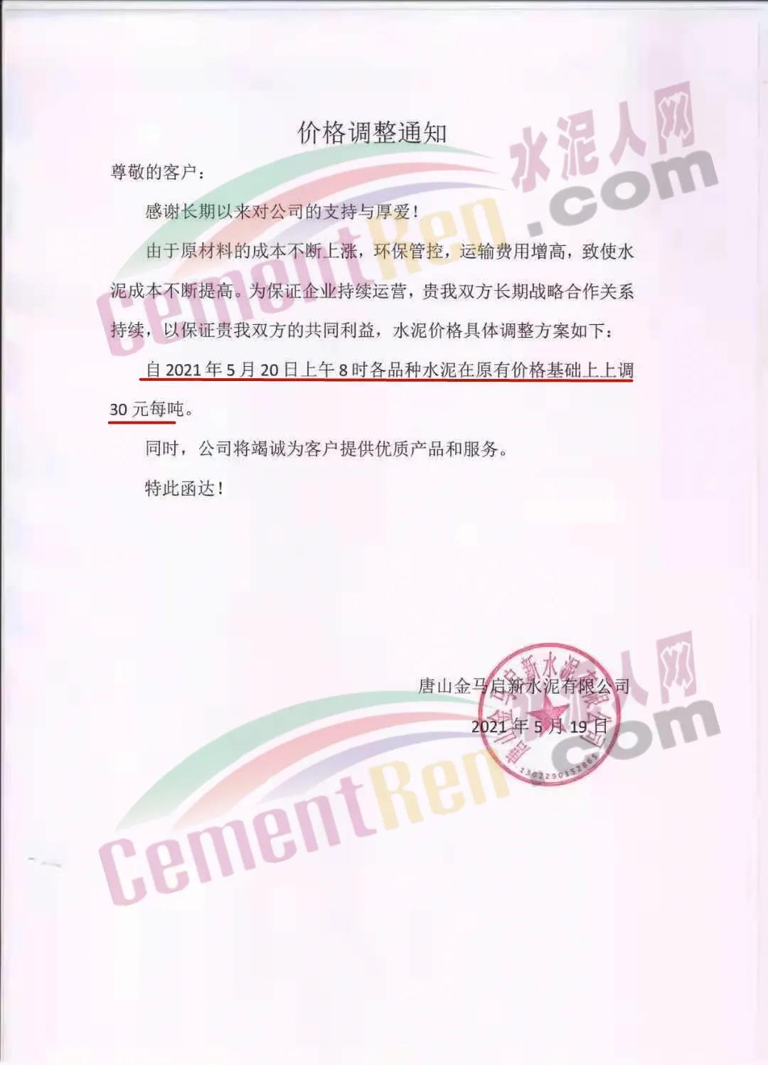 19日,唐山金馬啟新永泥有限公司通知,由于原材料的成本不斷上漲,環(huán)保管控,運(yùn)輸費(fèi)用增高,致使水泥成本不斷提高。自2021年5月20日上午8時(shí)起各品種水泥在原有價(jià)格基礎(chǔ)上上調(diào)30元/噸。