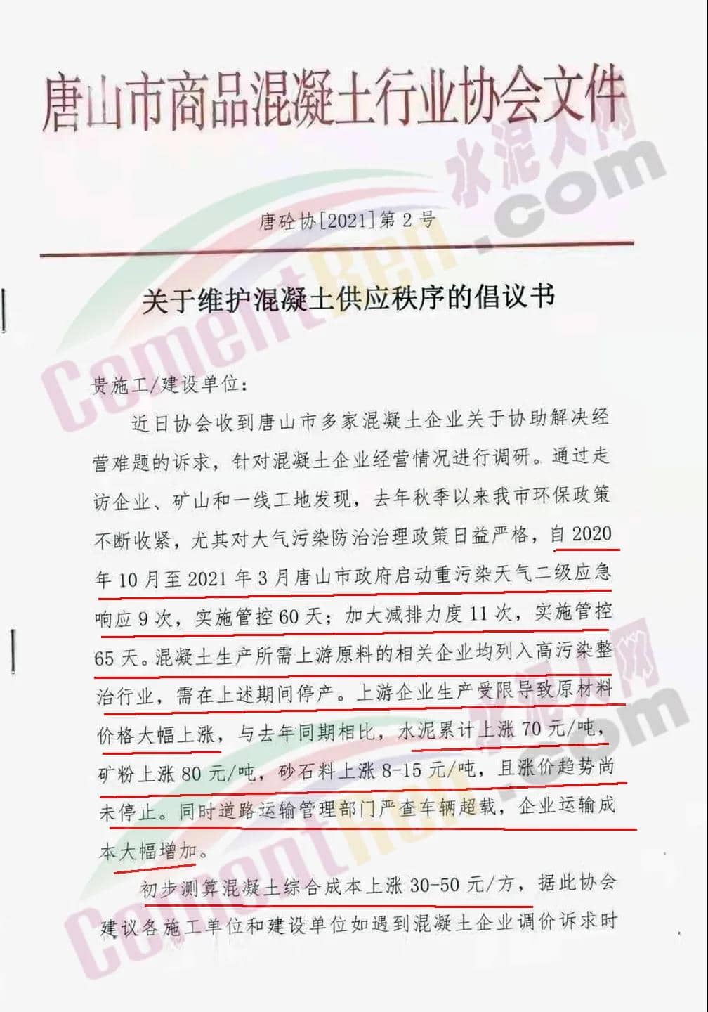 唐山市商品混凝土行業(yè)協(xié)會(huì)發(fā)布《關(guān)于維護(hù)混凝土供應(yīng)秩序的倡議書》給下游施工建設(shè)單位稱: