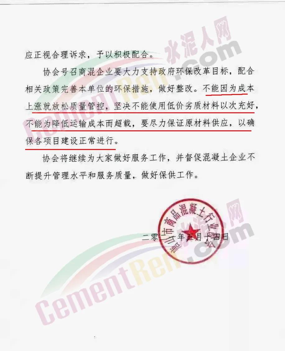 初步測(cè)算混凝土綜合成本上漲 30-50 元/方,據(jù)此協(xié)會(huì)建議各施工單位和建設(shè)單位如遇到混凝土企業(yè)調(diào)價(jià)訴求時(shí)應(yīng)正視合理訴求,予以積極配合。