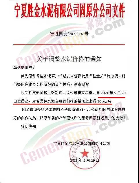 寧夏勝金水泥通知,5月20日起對各品種水泥上調30元/噸。