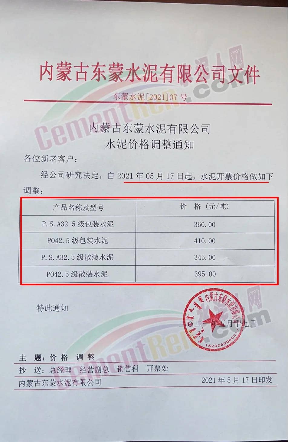 內蒙古東蒙水泥有限公司通知自5月17日起執行最新報價,其中PO42.5散裝水水泥報價395元/噸。