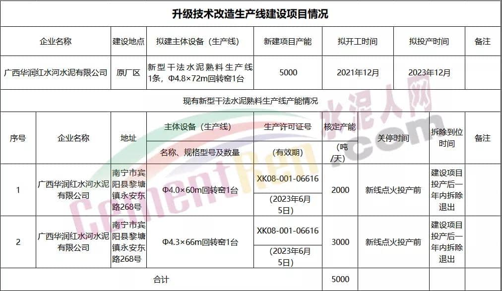 日前,廣西壯族自治區工業和信息化廳發布《關于廣西華潤紅水河水泥有限公司升級改造建設5000t/d水泥熟料生產線及協同處置項目產能情況的公示》稱,按照相關通知要求,將廣西華潤紅水河水泥有限公司升級改造建設5000t/d水泥熟料生產線及協同處置項目產能情況進行公示,具體公式如下: