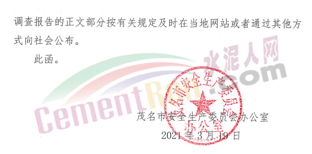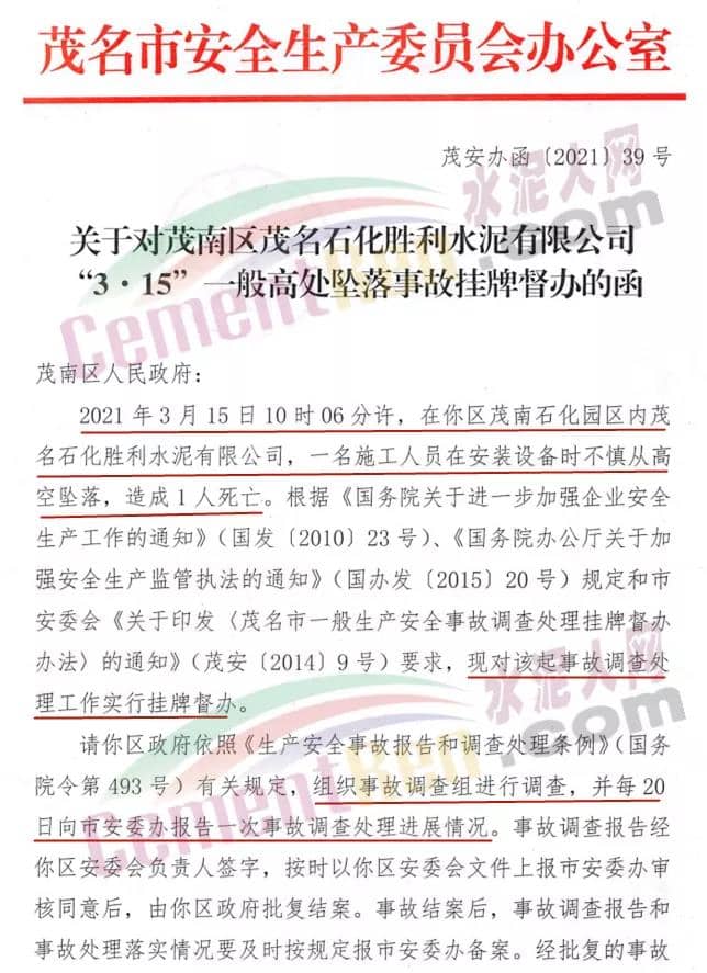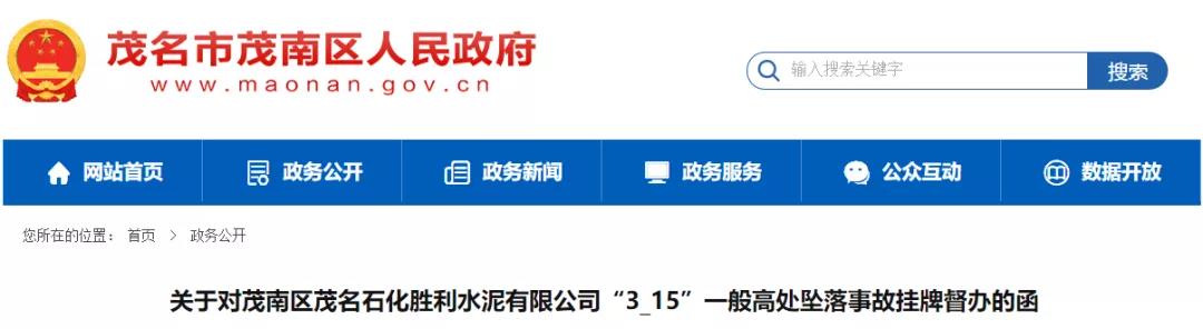 日前,廣東省茂名市茂南區(qū)人民政府發(fā)布《關(guān)于對茂南區(qū)茂名石化勝利水泥有限公司“3·15”一般高處墜落事故掛牌督辦的函》稱,根據(jù)相關(guān)通知要求,對茂南區(qū)茂名石化勝利水泥有限公司“3·15”一般高處墜落事故調(diào)查處理工作實行掛牌督辦。具體通知如下: