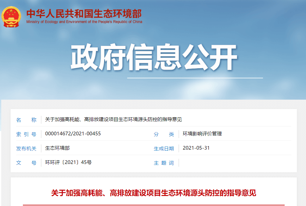 日前,中華人民共和國生態環境部發布《關于加強高耗能、高排放建設項目生態環境源頭防控的指導意見》,要求各級生態環境部門加強生態環境分區管控和規劃約束、嚴格“兩高”項目環評審批、推進“兩高”行業減污降碳協同控制、依排污許可證強化監管執法、依排污許可證強化監管執法。具體意見如下: