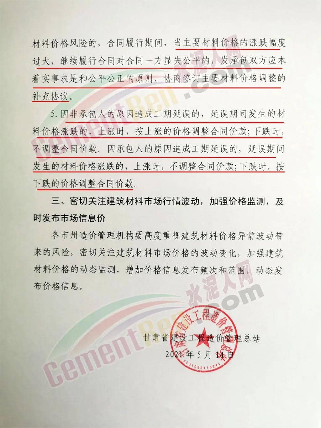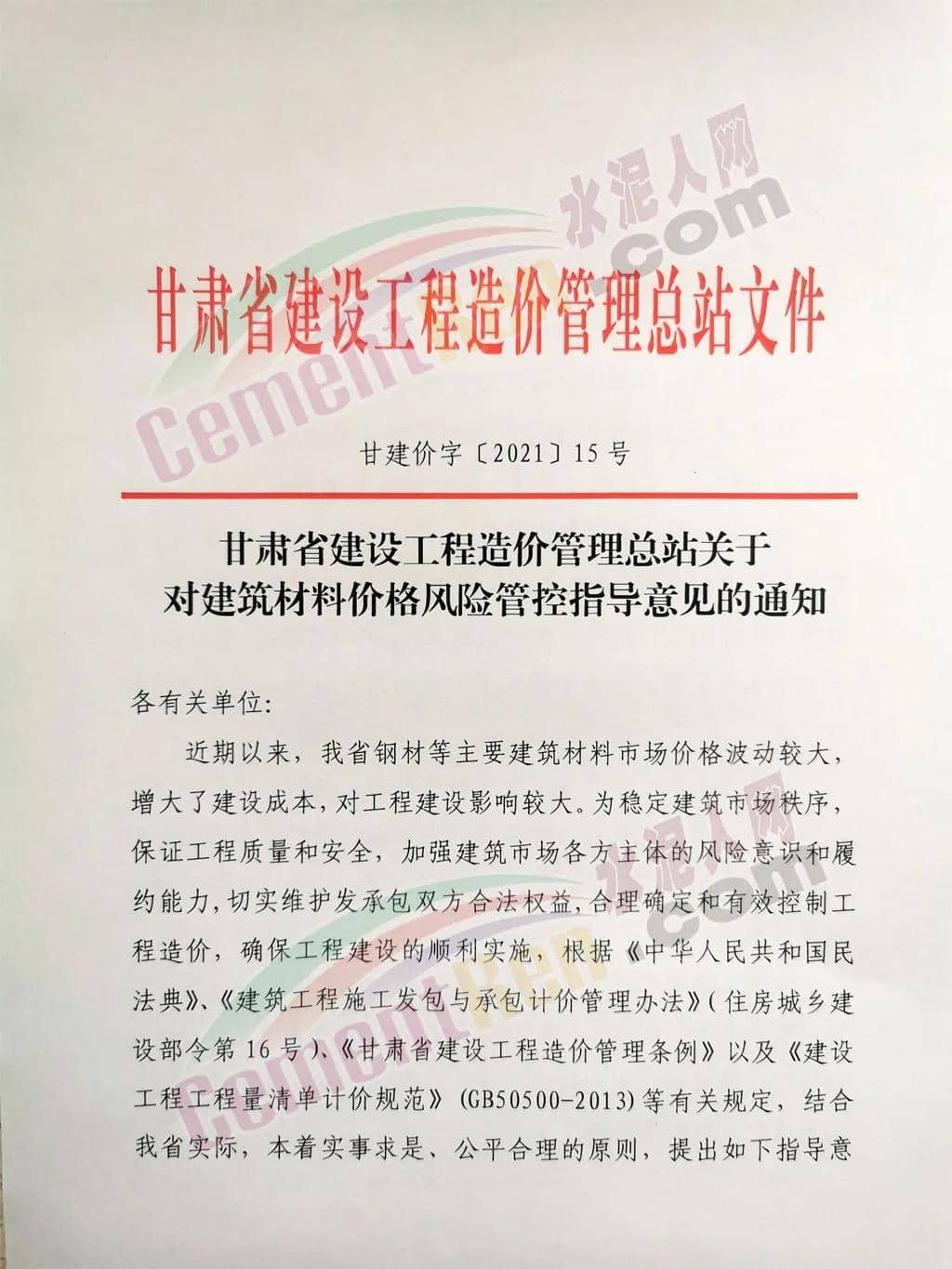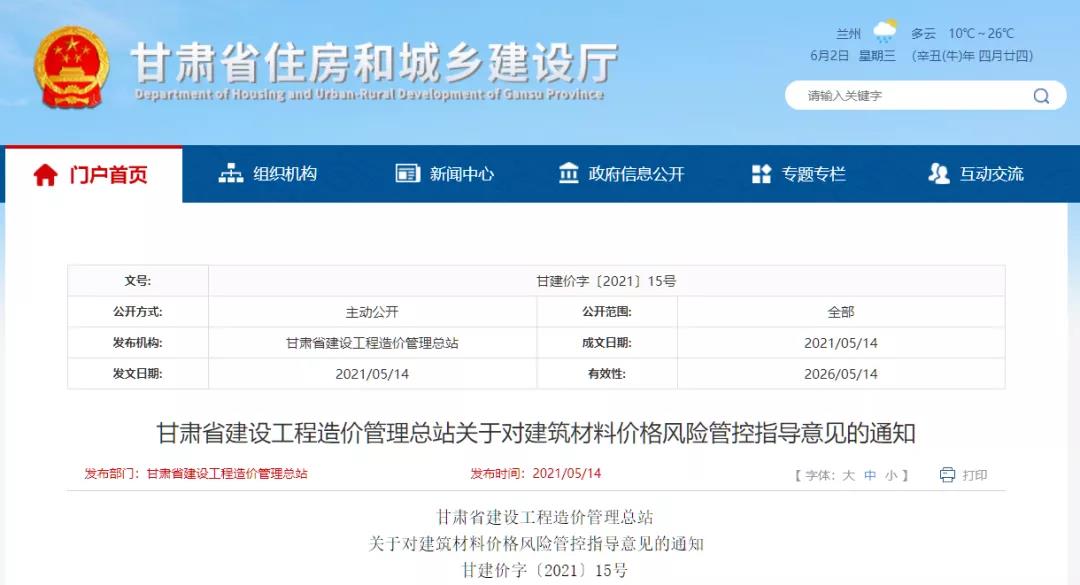 同期,甘肅省建設(shè)工程造價管理總站發(fā)布了關(guān)于對建筑材料價格風險管控指導(dǎo)意見的通知(甘建價字〔2021〕15號),建議風險幅度宜控制在5%以內(nèi)。