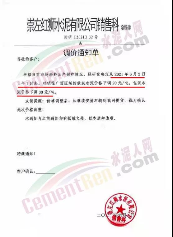 根據(jù)當(dāng)前市場(chǎng)形勢(shì),經(jīng)研究決定,我公司于2021年6月2日07:00起對(duì)銷(xiāo)往廣西區(qū)域的散裝水泥價(jià)格下調(diào)20元/噸,包裝水泥價(jià)格下調(diào)30元/噸。