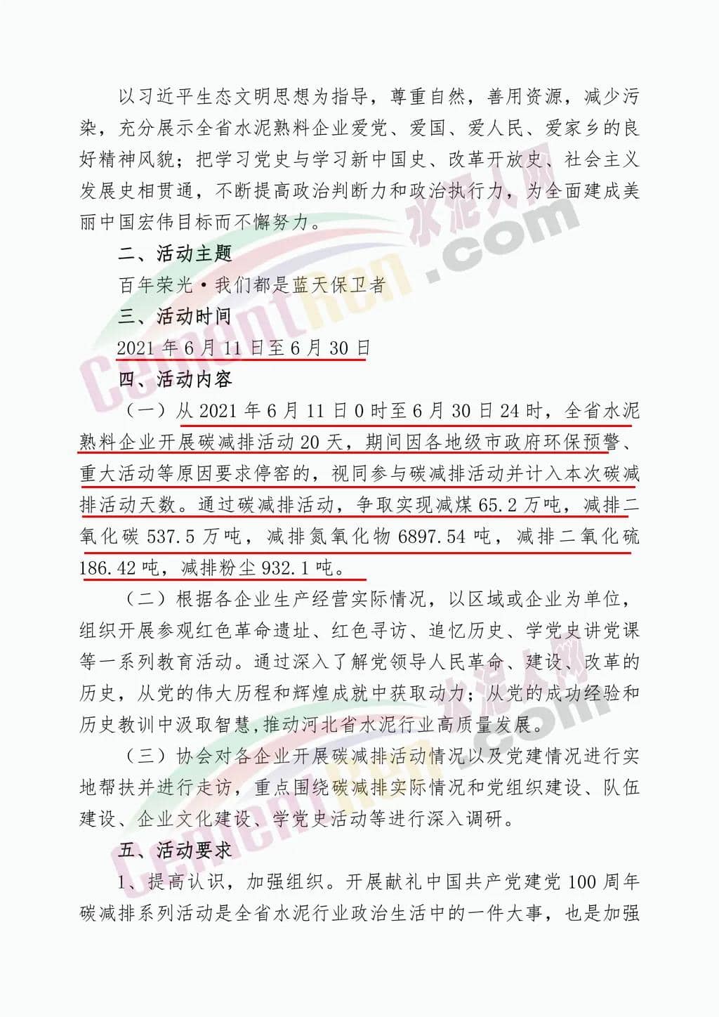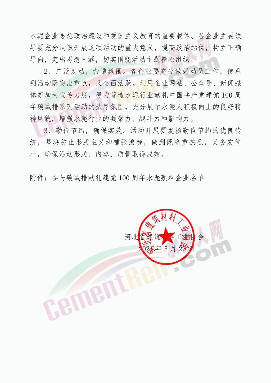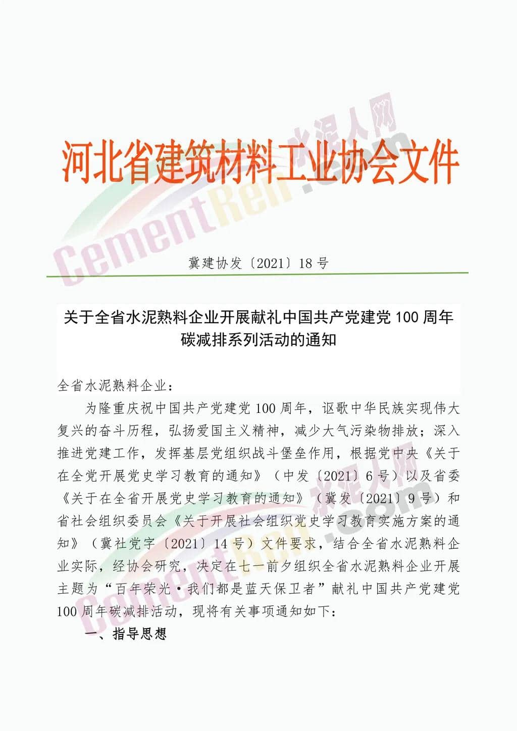 日前,河北省建筑材料工業協會發布《關于全省水泥熟料企業開展獻禮中國共產黨建黨100周年碳減排系列活動的通知》給全省水泥熟料企業稱,依據相關文件要求,結合全省水泥熟料企業實際,經研究決定在七一前夕組織全省水泥熟料企業開展獻禮中國共產黨建黨100周年碳減排活動。