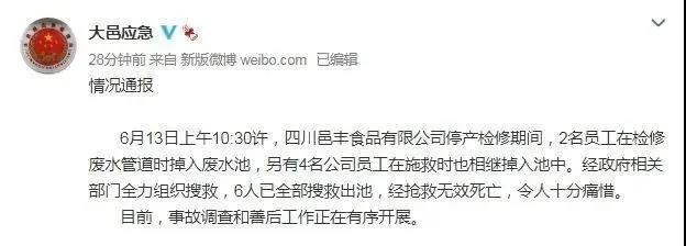 據大邑縣應急管理局通報,6月13日上午10:30許,四川邑豐食品有限公司停產檢修期間,2名員工在檢修廢水管道時掉入廢水池,另有4名公司員工在施救時也相繼掉入池中。經政府相關部門全力組織搜救,6人已全部搜救出池,經搶救無效死亡,令人十分痛惜。目前,事故調查和善后工作正在有序開展。