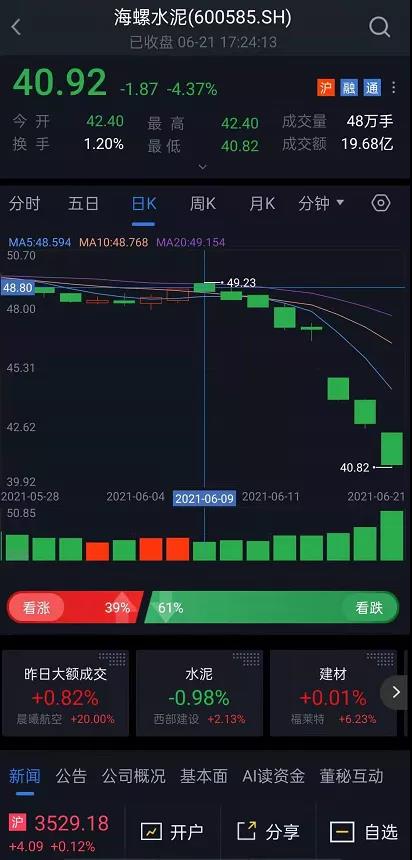 自2019年海螺水泥A股的最高價格63.5元/股到6月21日盤中最低價40.82元/股,近一年的時間,海螺水泥A股蒸發近1200億元。在股東群,有投資者吐槽稱,“海螺水泥再這樣跌下去,快熬不住了,真的是溫水煮青蛙”。