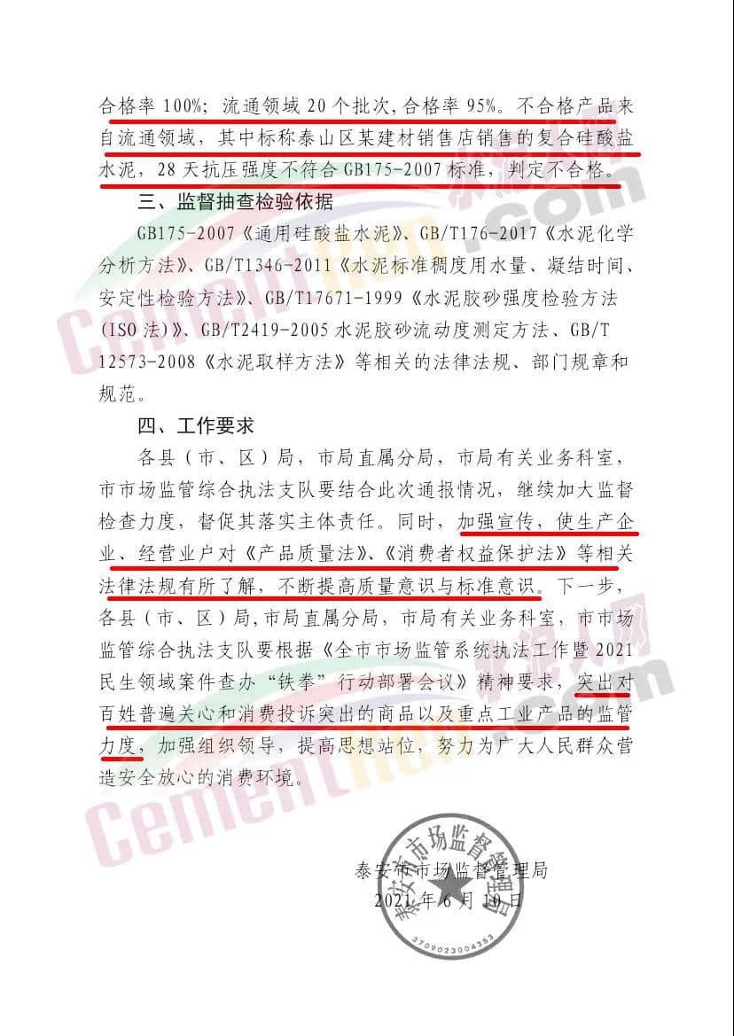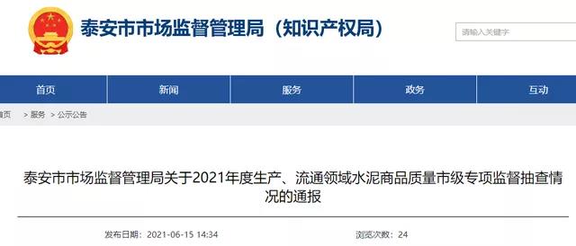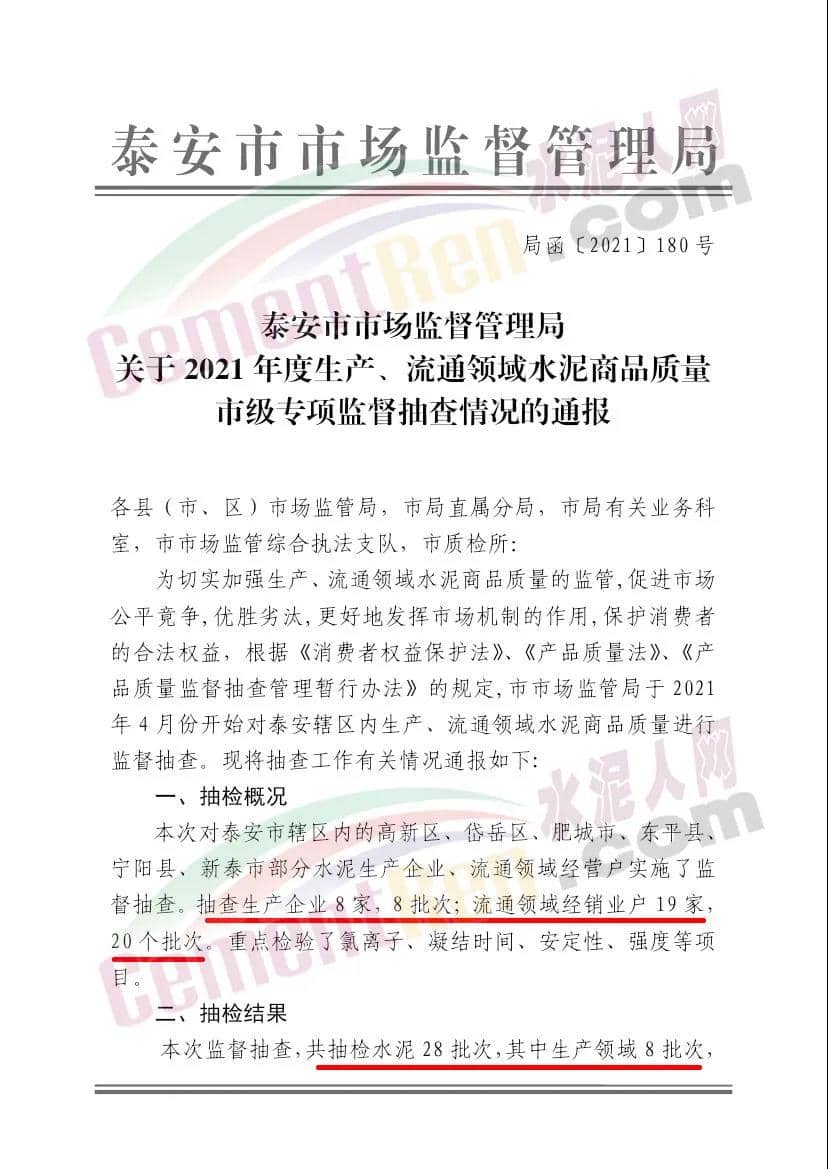日前,山東省泰安市市場監督管理局發布關于2021年度生產、流通領域水泥商品質量市級專項監督抽查情況的通報。