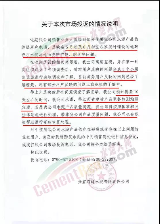 公司承諾:待江西省建材產品監督檢測站鑒定后,若是分宜海螺水泥產品質量問題,企業將按照國家相關法律法規進行處理;若非企業產品質量問題,分宜海螺也會積極幫助進行瓷磚恢復處理。