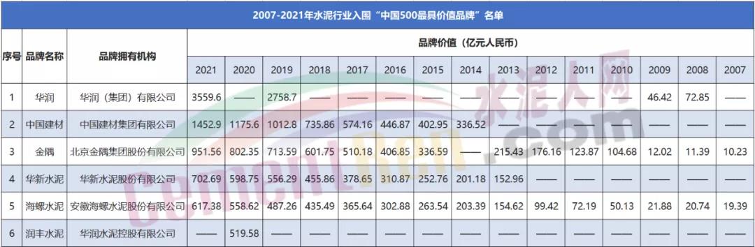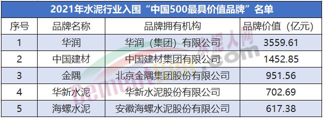 據(jù)了解,2021年水泥行業(yè)共有華潤、中國建材、金隅、華新、海螺5家水泥企業(yè)入圍中國500最具價值品牌名單,其中,華潤集團以3559.61億元的品牌價值位居水泥行業(yè)入圍名單榜首。
