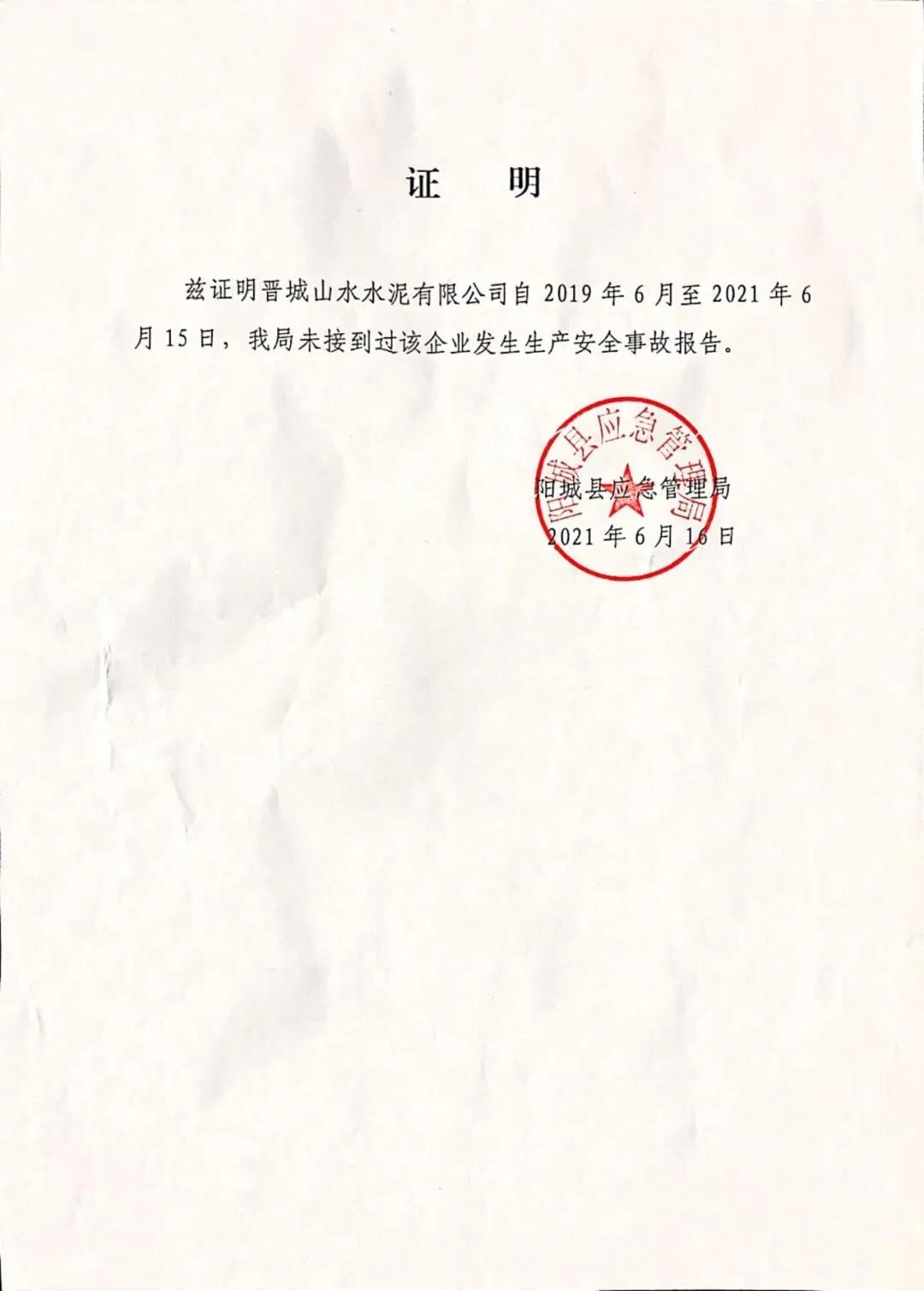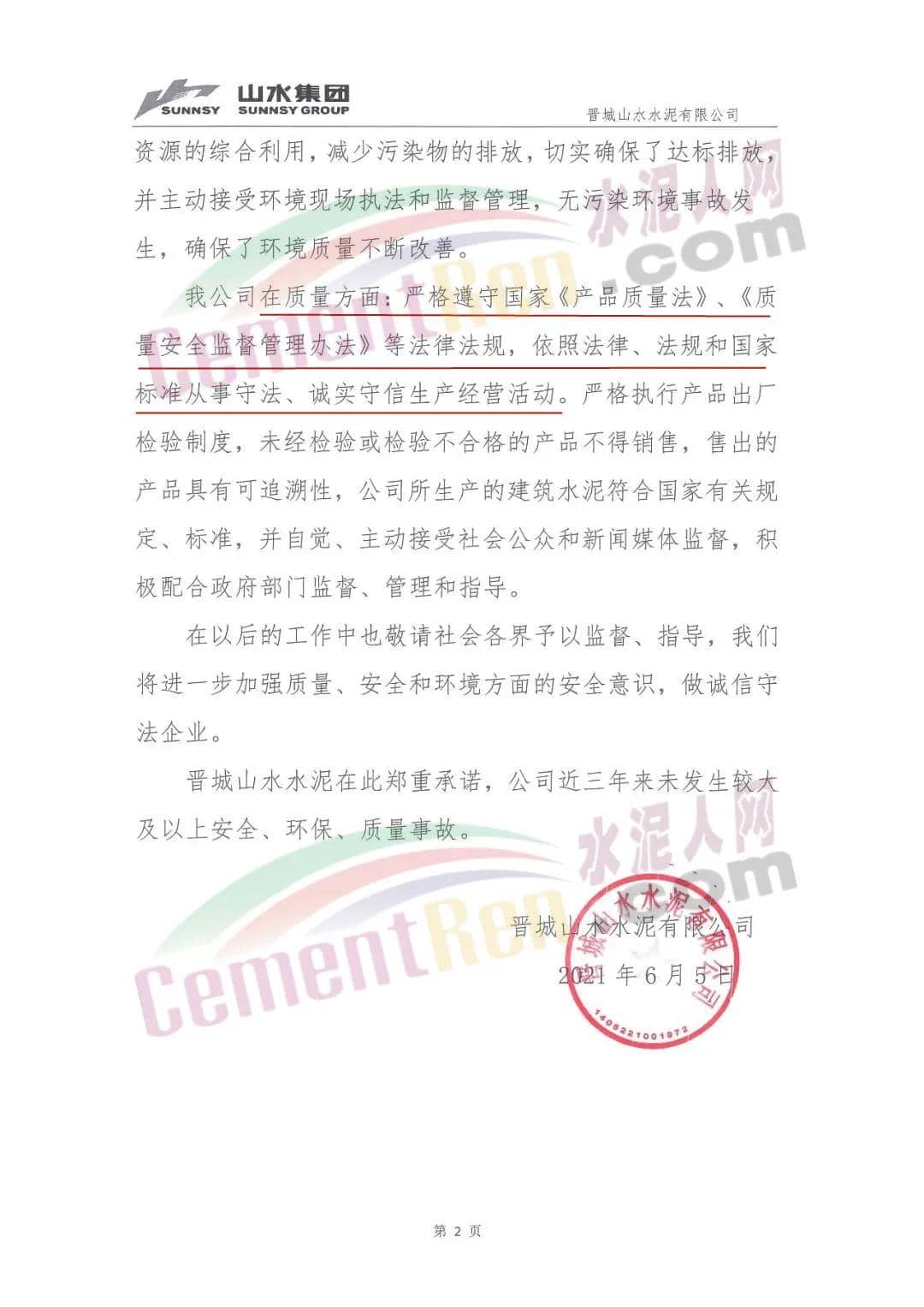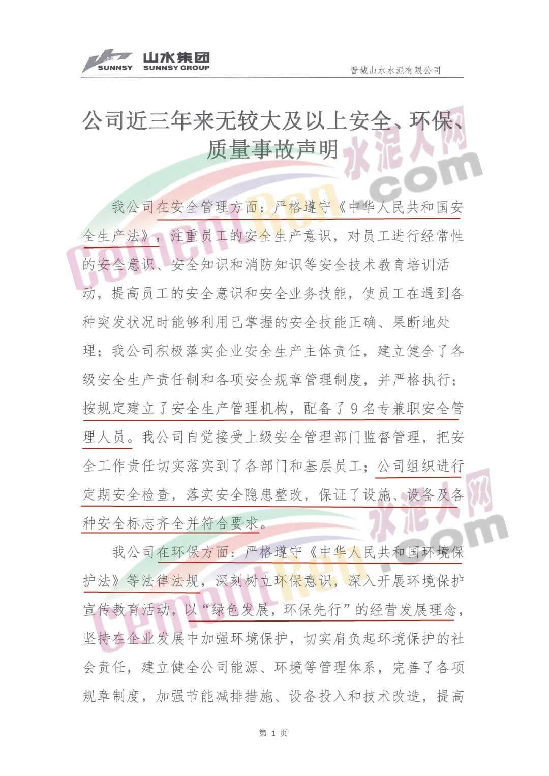 日前,晉城山水水泥有限公司發(fā)布《近三年來(lái)無(wú)較大及以上安全、環(huán)保、質(zhì)量事故聲明》稱(chēng),