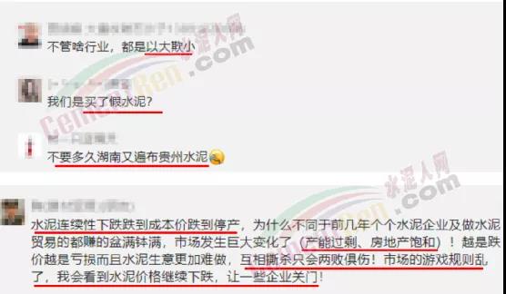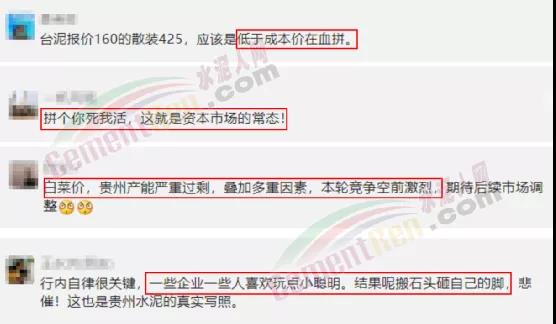 對于臺泥大幅度降價情況,市場中存在各種聲音,有人稱臺泥執(zhí)行的是“市場競爭”,其他企業(yè)則是“價格戰(zhàn)”;也是有人說臺泥是低于成本價在“血拼”;這是白菜價,貴州產能嚴重過剩,疊加多重因素,本輪競爭空前激烈,期待后續(xù)市場調整;都是被逼的,區(qū)域過剩嚴重,而且在臺泥之前,其他企業(yè)早就這么做了。