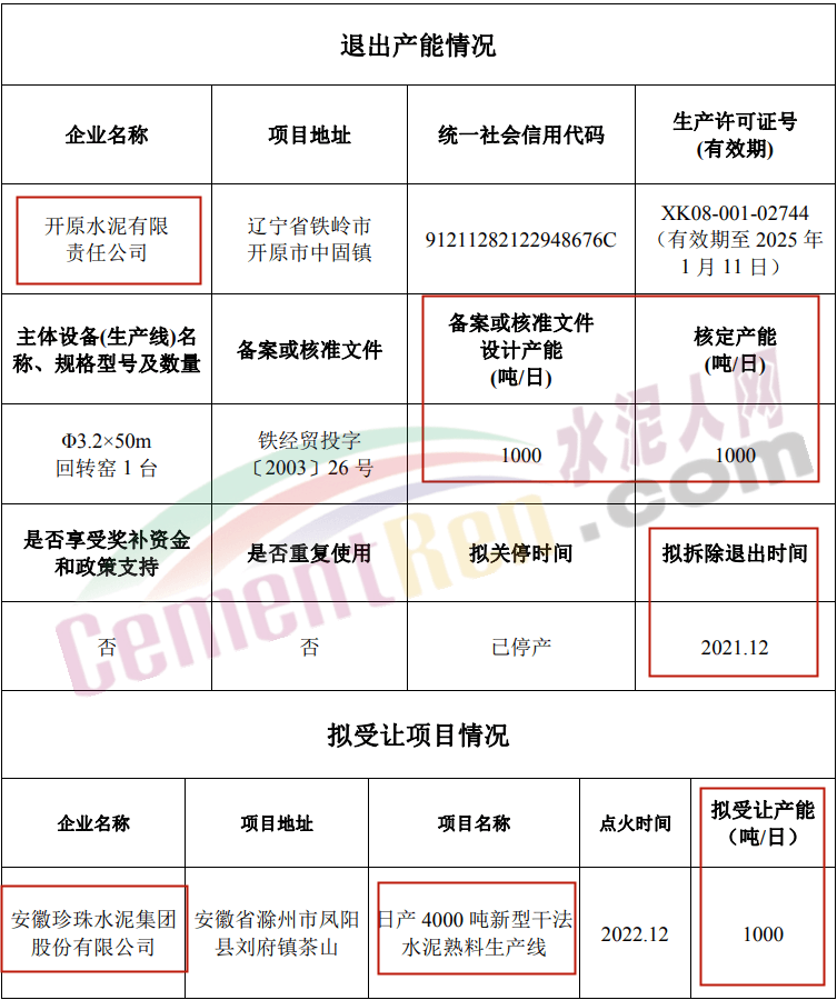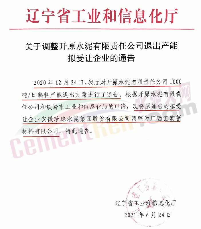 日前,遼寧省工業和信息化廳發布《關于調整開原水泥有限責任公司退出產能擬受讓企業的通告》將開原水泥有限責任公司1000t/d熟料產能的原擬受讓企業安徽珍珠水泥集團股份有限公司調整為廣西匯賓新材料有限公司。具體通告如下: