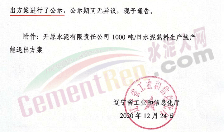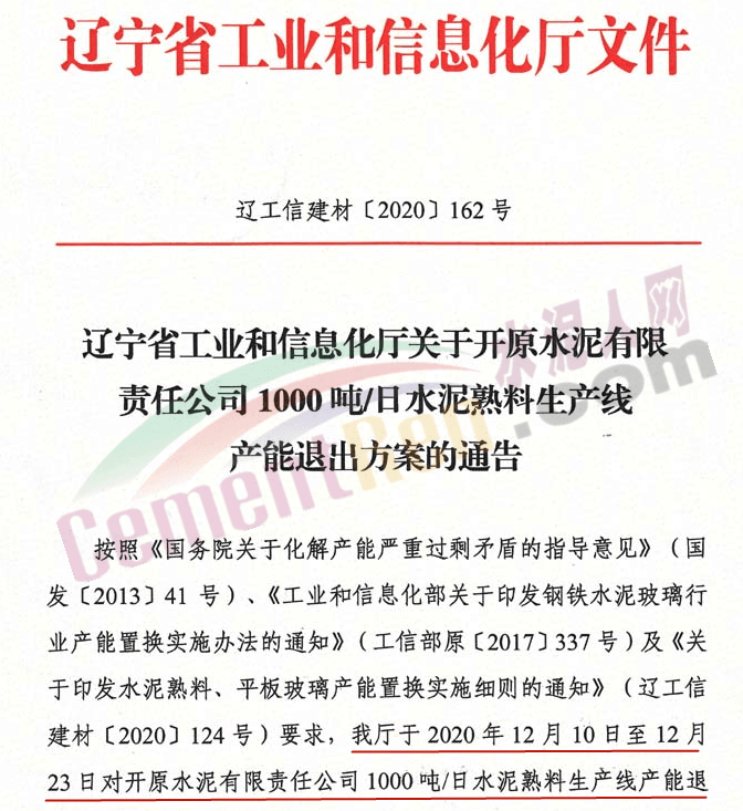據水泥人網了解,2020年12月24日,遼寧省工業和信息化廳發布《關于開原水泥有限責任公司1000噸/日水泥熟料生產線產能退出方案的通告》稱,按照相關文件要求,將開原水泥有限責任公司1000t/d水泥熟料產能置換至安徽安徽珍珠水泥集團股份有限公司用于新建一條4000t/d新型干法水泥熟料生產線。具體通告如下: