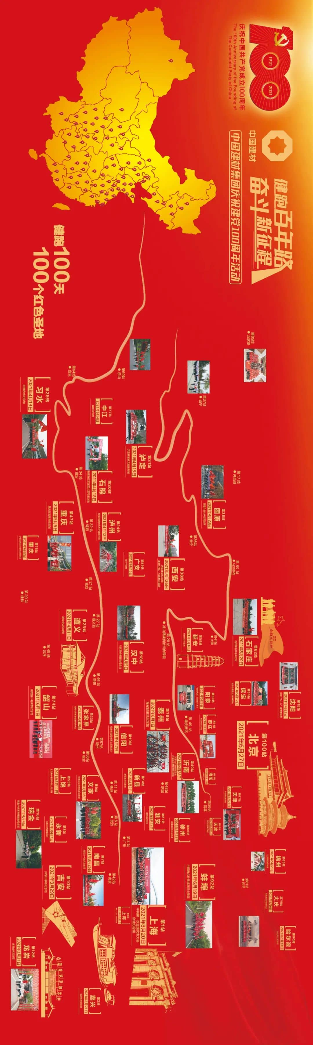 本次健跑活動路線全程5公里,按照中國地圖的形狀進行設計規劃,寓意著中國建材人深沉的愛黨愛國情懷。賽道沿途還制作了黨史事件標識牌,記錄和濃縮了中國共產黨百年奮進的光輝歷程,激勵引導大家不忘初心、牢記使命,啟航新征程。
