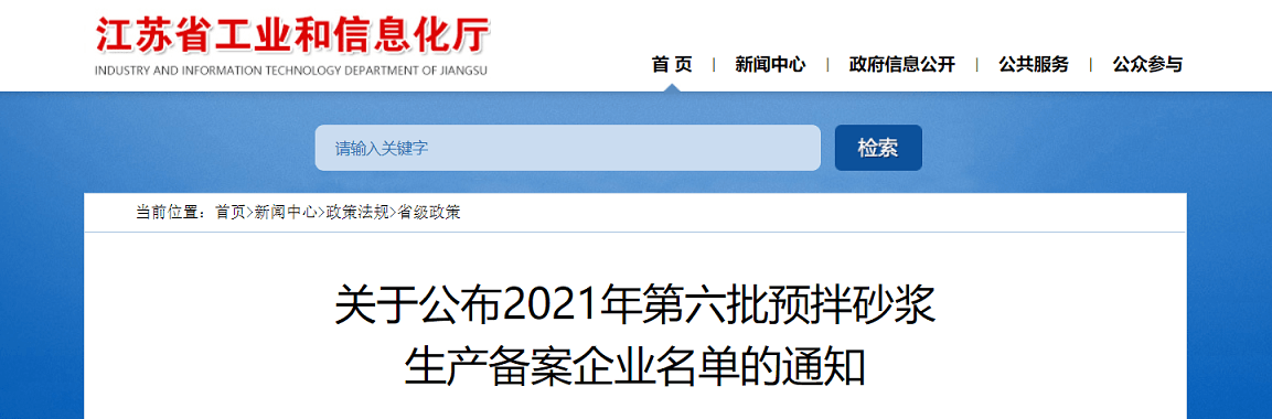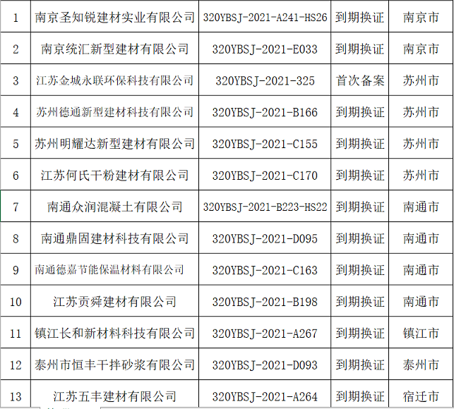 根據《江蘇省散裝水泥促進條例》《江蘇省預拌砂漿生產企業備案管理辦法》(蘇經信節能〔2010〕1130號)和《關于進一步做好全省預拌砂漿生產企業備案工作的通知》(蘇散字〔2015〕20號)有關規定,有關設區市散裝水泥行政主管部門組織了轄區內申報企業的現場檢查或資料審核,南京圣知銳建材實業有限公司等13家單位符合預拌砂漿生產企業備案條件。經復核,同意該13家單位為2021年第六批預拌砂漿生產備案企業并向社會公布。