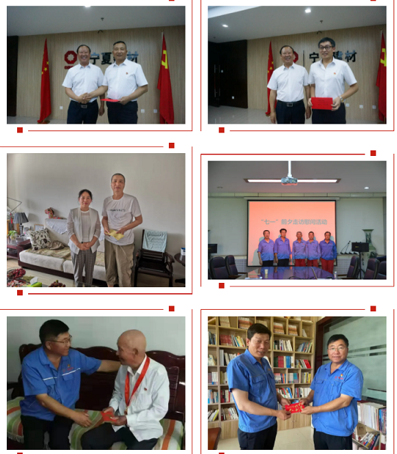 近日,寧夏建材各級黨組織通過組織座談會、下基層、進家門、送關懷等形式對30名獲得縣級以上優秀黨員、優秀黨務工作者,12名困難黨員和3名離退休老干部進行了慰問,并向他們轉達了黨組織對他們的關懷,褒揚他們為公司的經營發展作出的貢獻,了解他們的思想動態和具體訴求,積極幫助他們解決實際困難。