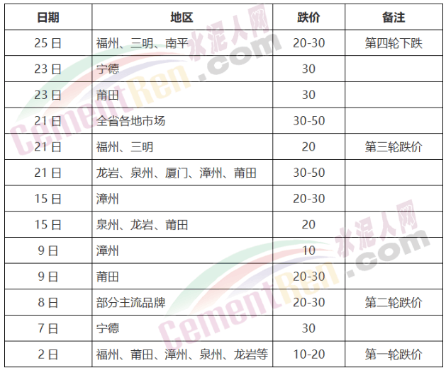 21日福建地區(qū)部分品牌水泥針對全省各地市場報(bào)價(jià)下跌30-50元/噸,開啟第四輪價(jià)格下跌,市場行情不佳,后期價(jià)格或以跌勢為主。