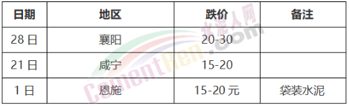 本月內(nèi)湖北襄陽、咸寧、恩施等多地水泥價(jià)格小幅下調(diào)15-30元/噸。