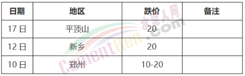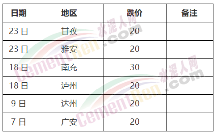 四川省甘孜州、雅安、南充、瀘州、達(dá)州、廣安在6月內(nèi)多區(qū)域水泥價(jià)格下調(diào)20-30元/噸。