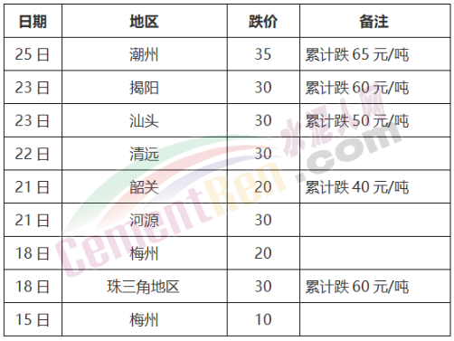 廣東省自6月20日開始,潮州、揭陽、汕頭、韶關(guān)等多地水泥價(jià)格持續(xù)下跌,兩周內(nèi)累計(jì)下跌達(dá)40-65元/噸。跌價(jià)后各區(qū)域水泥價(jià)格跌破500元/噸,保持在400-470元/噸。