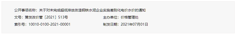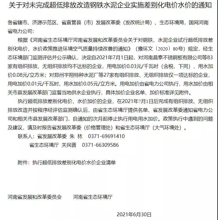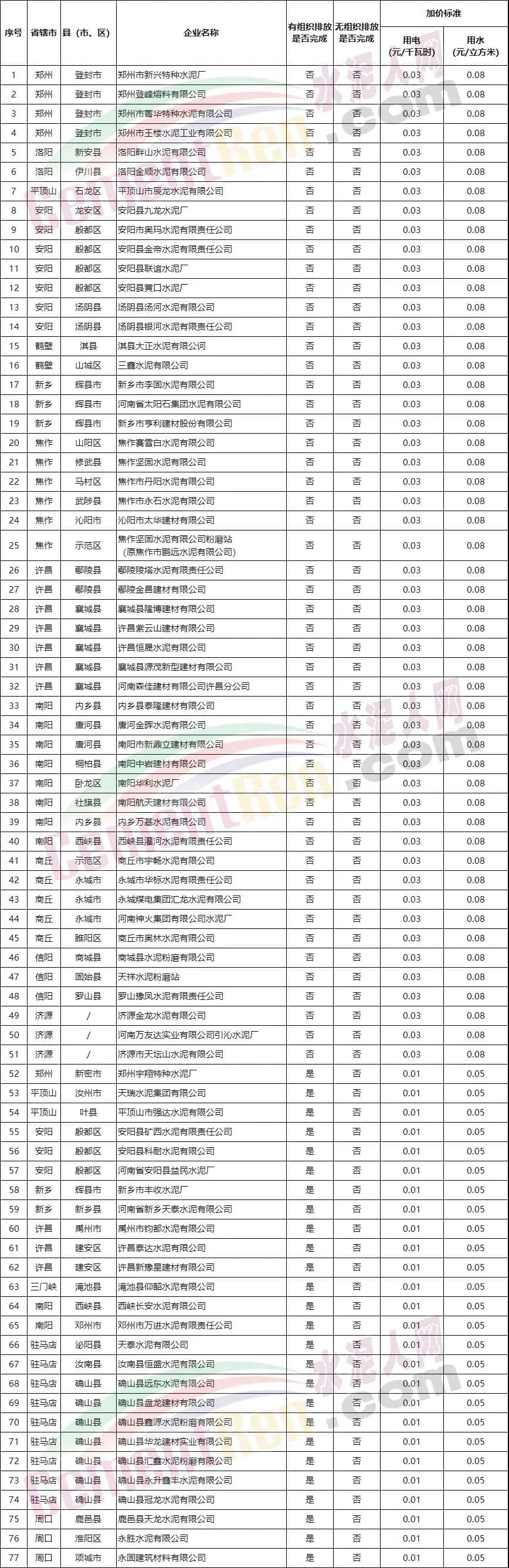 7月1日,河南省發改委發布《關于對未完成超低排放改造鋼鐵水泥企業實施差別化電價水價的通知》。根據通知,河南省發改委決定自2021年7月1日起,對河南昌泰不銹鋼板有限公司等83家有組織排放、無組織排放均不達標的企業,用電加價0.03元/千瓦時、用水加價0.08元/立方米;對鄭州宇翔特種水泥廠等27家有組織排放、無組織排放僅一項達標的企業,用電加價0.01元/千瓦時、用水加價0.05元/立方米。 執行超低排放差別化電價水價 部分水泥企業名單