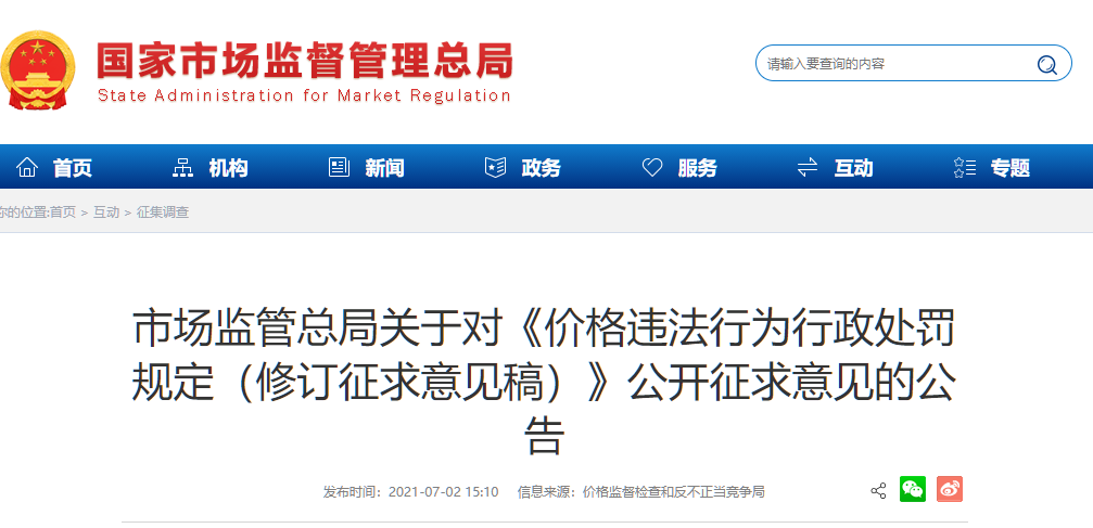 7月2日,市場監管總局發布《關于對<價格違法行為行政處罰規定(修訂征求意見稿)>公開征求意見的公告》稱為貫徹落實1月20日國常會部署,加快修訂價格違法行為行政處罰等方面法規,及時修改或廢除不合理的行政處罰事項,更大激發市場主體活力,市場監管總局起草了《價格違法行為行政處罰規定(修訂征求意見稿)》,現向社會公開征求意見。歡迎各有關單位和個人提出意見和建議,并于2021年8月2日前反饋市場監管總局。