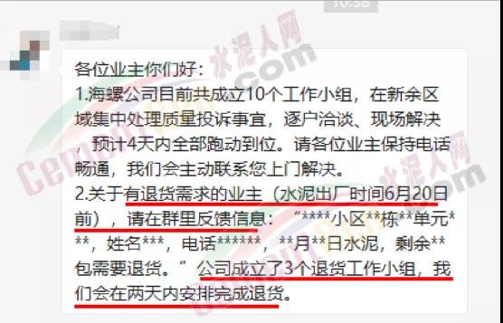 6月29日上午,海螺水泥相關負責人在業主群里發布消息稱,有退貨需求的業主,且水泥出廠時間在6月20日前的,可在群里反饋信息。公司已經成立了3個退貨工作小組,會在兩天內安排完成退貨。