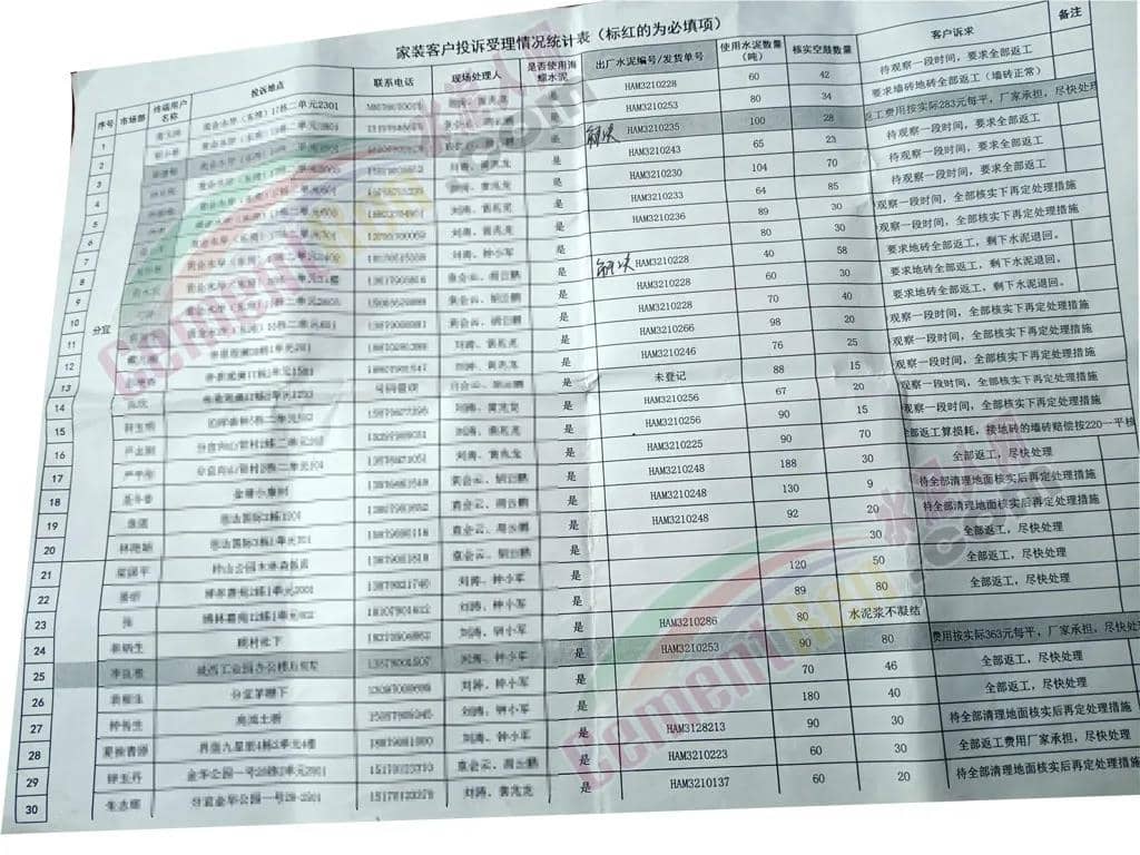 據不完全統計,使用水泥數量達2570噸,客戶訴求為部分或全部返工,剩余水泥退回。也有業主訴求觀察一段時間,再核實定下步處理措施。個別業主要自行處理,其費用分別為283元/平方、363元/平方由廠家承擔。