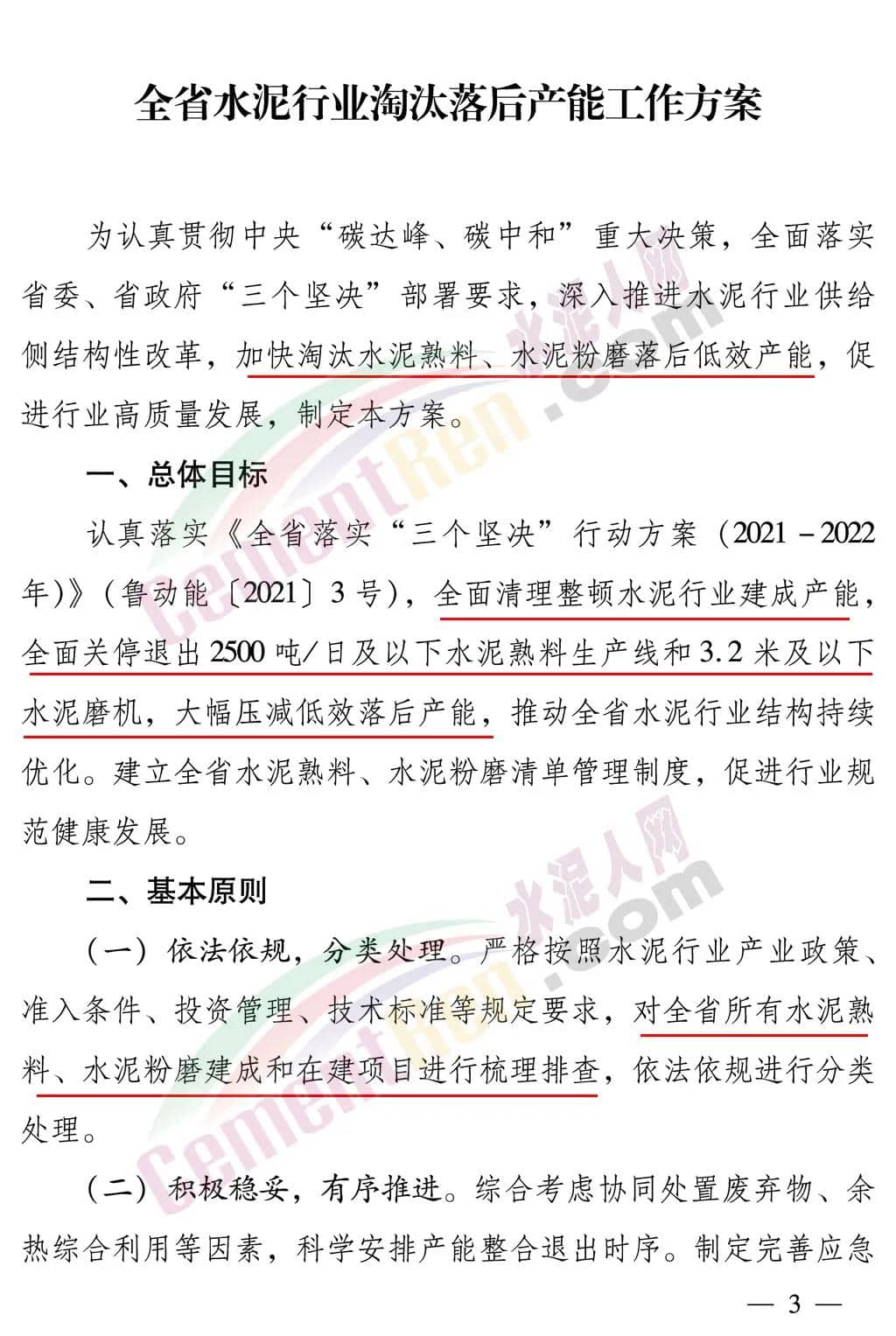 方案要求各市工業和信息化局、發展和改革委員會、自然資源局、生態環境局、市場監督管理局認真落實《全省落實“三個堅決”行動方案(2021-2022年)》(魯動能〔2021〕3號),全面清理整頓水泥行業建成產能,全面關停退出2500噸/日及以下水泥熟料生產線和3.2米及以下水泥磨機,大幅壓減低效落后產能,推動全省水泥行業結構持續優化。