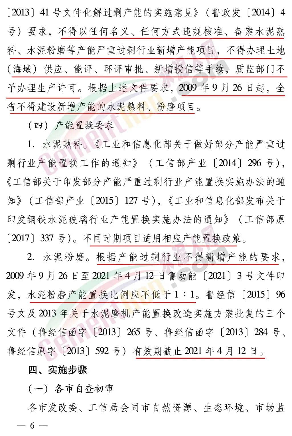 對2500噸/日以上水泥熟料生產線(特種水泥熟料和化工配套水泥熟料生產線除外)、3.2米以上水泥磨機違規項目,各市發改委、工信局會同市相關部門嚴格履行屬地責任,責令企業立即停產整頓。3.8米及以上符合相關條件要求的項目,且按照魯動能〔2021〕3號文件標準落實置換產能的,依法依規完善相關手續后方可生產。2022年6月底前,相關手續仍不完備的,各市工信局、發改委會同市相關部門于2022年12月底前組織進行拆除退出并完成市級驗收工作。