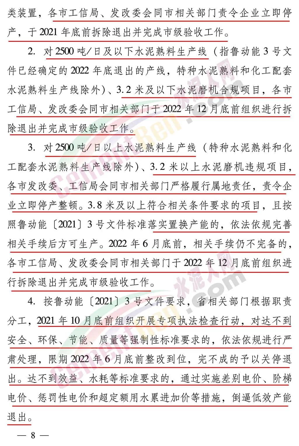 對2500噸/日及以下水泥熟料生產線(指魯動能3號文件已經確定的2022年底退出的產線,特種水泥熟料和化工配套水泥熟料生產線除外)、3.2米及以下水泥磨機合規項目,各市工信局、發改委會同市相關部門于2022年12月底前組織進行拆除退出并完成市級驗收工作。