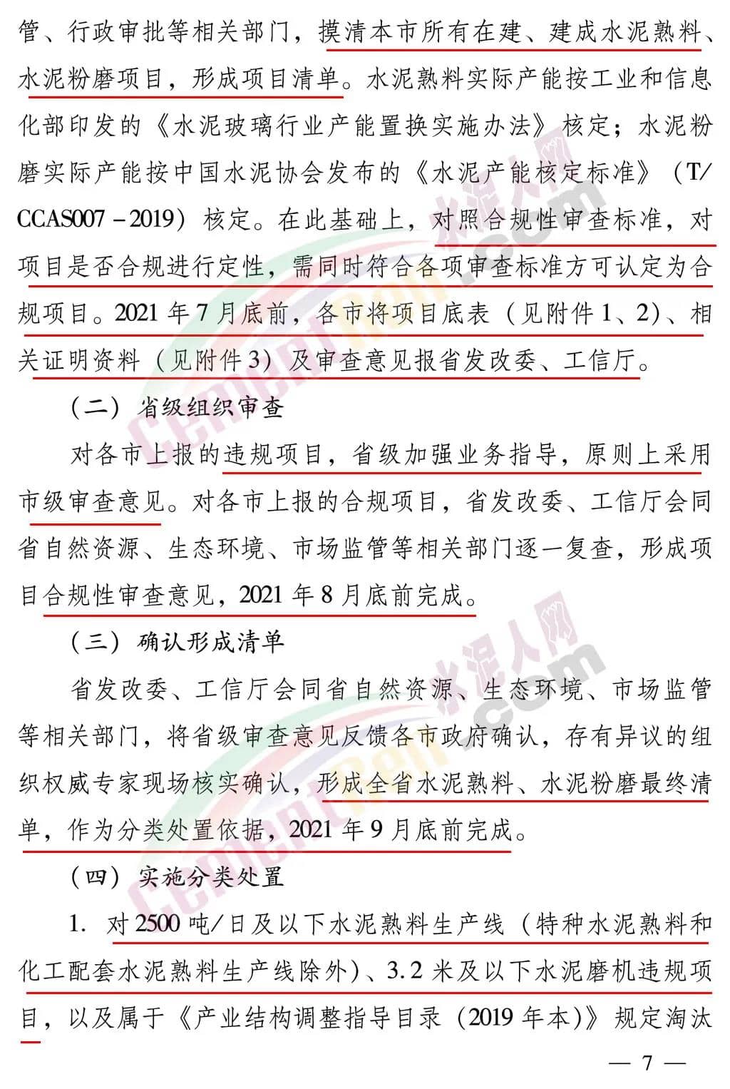 方案要求2021年7月底前,各市將項目底表、相關證明資料及審查意見報省發改委、工信廳;對各市上報的合規項目,省發改委、工信廳會同省自然資源、生態環境、市場監管等相關部門逐一復查,形成項目合規性審查意見,2021年8月底前完成;省發改委、工信廳會同省自然資源、生態環境、市場監管等相關部門,將省級審查意見反饋各市政府確認,存有異議的組織權威專家現場核實確認,形成全省水泥熟料、水泥粉磨最終清單,作為分類處置依據,2021年9月底前完成。