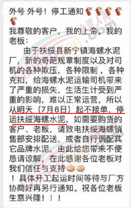 日前,有物流司機在群里發通知消息稱:“由于扶綏縣新寧鎮海螺水泥廠,新的奇葩規章制度以及對司機的各種欺壓,各種限制,各種克扣,給海螺水泥運輸司機帶來了嚴重的損失,生活生計受到嚴重的影響,難以正常運營,所以從7月6日起不接單,停運扶綏海螺水泥。”