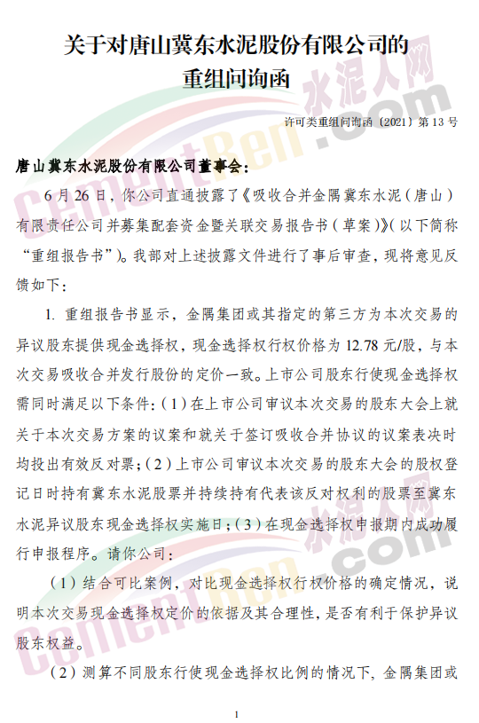 請公司就上述問題做出書面說明,并在7月14日前將有關(guān)說明材料對外披露并報送深交所上市公司管理一部。《關(guān)于對唐山冀東水泥股份有限公司的重組問詢函》全文如下: