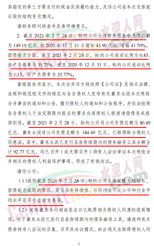 重組報告書顯示,本次合并雙方將按照《公司法》及相關(guān)法律、法規(guī)和規(guī)范性文件的規(guī)定向各自債權(quán)人發(fā)布有關(guān)冀東水泥本次吸收合并事宜的通知和公告,履行債權(quán)人的通知和公告程序,并依法按照各自債權(quán)人于法定期限內(nèi)提出的要求向其債權(quán)人提前清償債務(wù)或提供擔保。截至2021年2月28日,標的公司母公司負債總額為80.49億元、冀東水泥母公司負債總額為184.49億元,已取得部分債權(quán)人同意函。其中,冀東水泥已發(fā)行且在存續(xù)期內(nèi)的債務(wù)融資工具余額合計92.77億元,均已召開(或無需召開)持有人會議審議本次吸收合并相關(guān)的債權(quán)人利益保護事項,形成了有效決議。請公司: