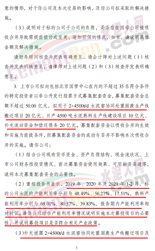 上市公司擬向包括北京國管中心在內(nèi)的不超過35名符合條件的特定投資者以非公開發(fā)行股票方式募集配套資金,募集配套資金總額不超過50.00億元,擬用于2×4500t/d水泥窯協(xié)同處置固廢生產(chǎn)線搬遷項目20億元、日產(chǎn)4500噸水泥熟料生產(chǎn)線建設(shè)項目10億元、補充流動資金和償還債務(wù)20億元。募集配套資金以吸收合并的生效和實施為前提條件,但募集配套資金的成功與否并不影響本次吸收合并的實施。請公司: