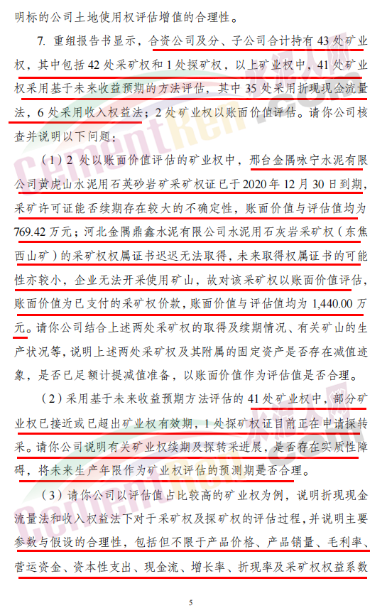 (1)兩處以賬面價值評估的礦業(yè)權(quán)中,邢臺金隅詠寧水泥有限公司黃虎山水泥用石英砂巖礦采礦權(quán)證已于2020年12月30日到期,采礦許可證能否續(xù)期存在較大的不確定性,賬面價值與評估值均為769.42萬元;河北金隅鼎鑫水泥有限公司水泥用石灰?guī)r采礦權(quán)(東焦西山礦)的采礦權(quán)權(quán)屬證書遲遲無法取得,未來取得權(quán)屬證書的可能性亦較小,企業(yè)無法開采使用礦山,故對該采礦權(quán)以賬面價值評估,賬面價值為已支付的采礦權(quán)價款,賬面價值與評估值均為1,440.00萬元。