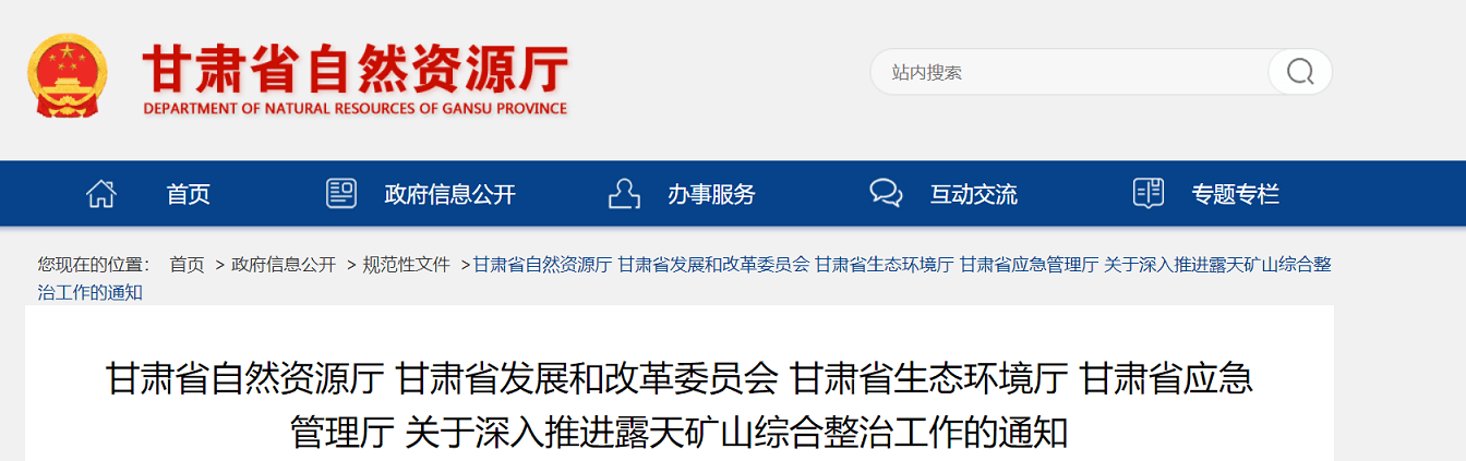 打贏藍(lán)天保衛(wèi)戰(zhàn),是黨的十九大做出的重大決策部署。按照《國(guó)務(wù)院關(guān)于印發(fā)打贏藍(lán)天保衛(wèi)戰(zhàn)三年行動(dòng)計(jì)劃的通知》(國(guó)發(fā)〔2018〕22號(hào))、《甘肅省人民政府關(guān)于印發(fā)甘肅省打贏藍(lán)天保衛(wèi)戰(zhàn)三年行動(dòng)作戰(zhàn)方案(2018-2020年)的通知》(甘政發(fā)〔2018〕68號(hào))及《自然資源部辦公廳生態(tài)環(huán)境部辦公廳關(guān)于加快完成露天礦山綜合整治工作意見(jiàn)的函》(自然資辦函〔2020〕1759號(hào))有關(guān)要求,各級(jí)各部門緊密配合,有序推進(jìn)露天礦山綜合整治工作,成效逐步顯現(xiàn)。為進(jìn)一步鞏固、深化露天礦山綜合治理成效,嚴(yán)格露天礦山開(kāi)發(fā)管控,保護(hù)礦山生態(tài)環(huán)境,經(jīng)省政府主要領(lǐng)導(dǎo)、分管領(lǐng)導(dǎo)審閱同意,現(xiàn)將有關(guān)事項(xiàng)通知如下: