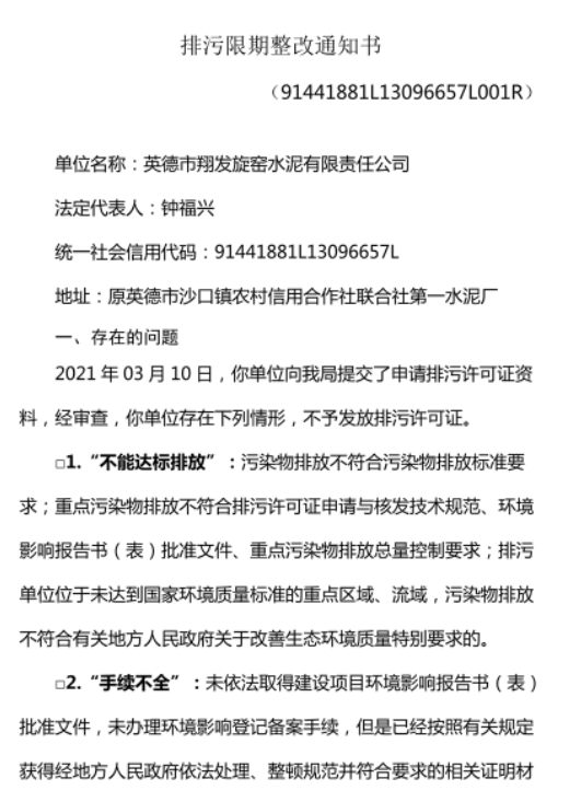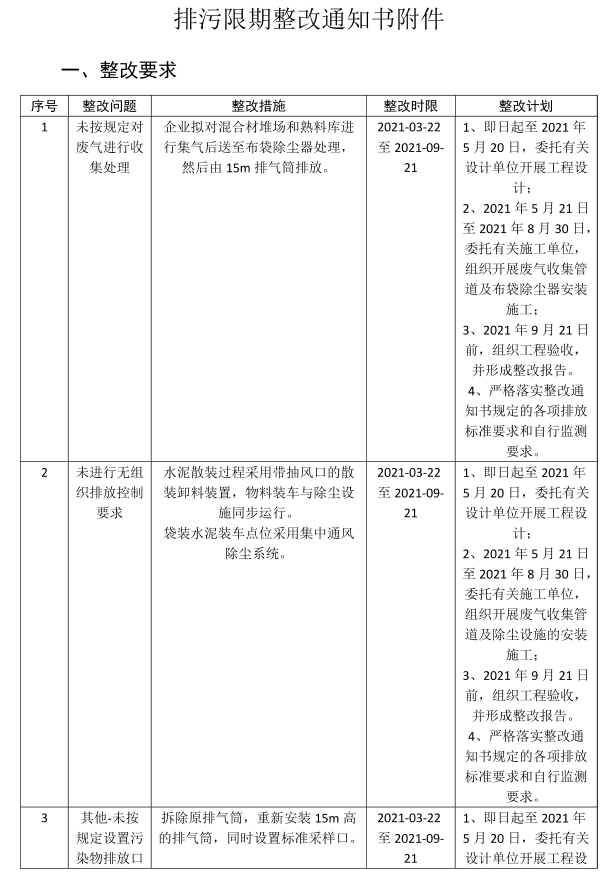 其中,今年3月30日下達限期整改的廣東清遠英德市翔發(fā)旋窯水泥有限責任公司整改問題為“未按規(guī)定對廢氣進行收集處理、未進行無組織排放控制要求、其他-未按規(guī)定設(shè)置污染物排放口、未完成自主驗收手續(xù)”等。企業(yè)整改措施、整改計劃如下: