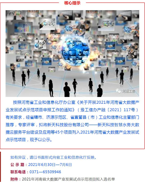 按照河南省工業(yè)和信息化廳辦公室《關(guān)于開展2021年河南省大數(shù)據(jù)產(chǎn)業(yè)發(fā)展試點(diǎn)示范項目申報工作的通知》(豫工信辦產(chǎn)融〔2021〕117號)有關(guān)要求,經(jīng)省轄市、濟(jì)源示范區(qū)、省直管縣(市)工業(yè)和信息化主管部門推薦、專家評審,7月初,河南省工業(yè)和信息化廳產(chǎn)業(yè)融合辦公室公布2021年河南省大數(shù)據(jù)產(chǎn)業(yè)發(fā)展試點(diǎn)示范項目名單。