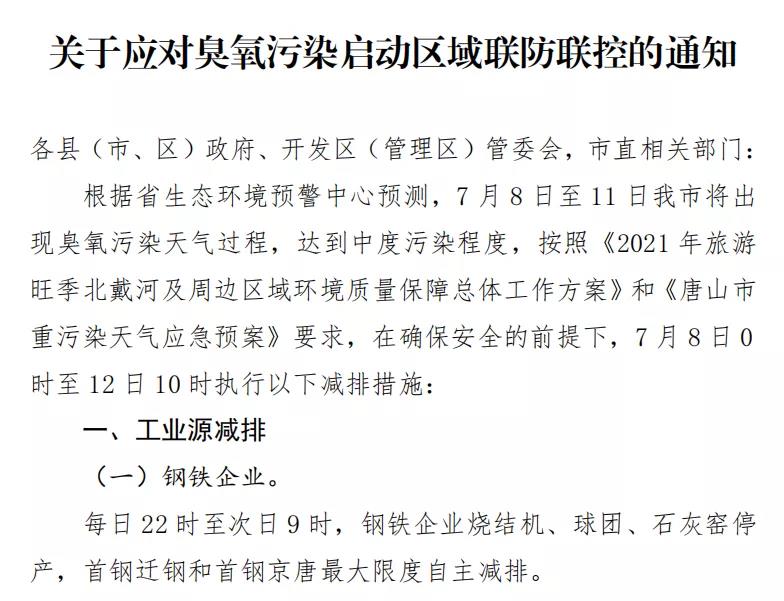 7月7日唐山市大氣污染防治工作領導小組辦公室發布《關于應對臭氧污染啟動區域聯防聯控的通知》稱,根據省生態環境預警中心預測,7月8日至11日唐山市將出現臭氧污染天氣過程,達到中度污染程度,按照《2021年旅游旺季北戴河及周邊區域環境質量保障總體工作方案》和《唐山市重污染天氣應急預案》要求,在確保安全的前提下,7月8日0時至12日10時執行減排措施.