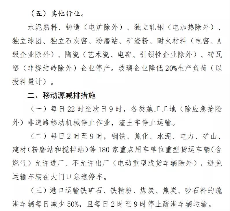 每日22時至次日9時,各類施工工地非道路移動機械停止作業,渣土車停止運輸。每日2時至9時,鋼鐵、焦化、水泥、電力、礦山、建材(粉磨站和攪拌站)等180家重點用車單位重型貨運車輛允許進廠、不允許出廠,避免運輸車輛在大門口怠速停車。港口運輸鐵礦石、鐵精粉、煤炭、焦炭、砂石料的疏港車輛每日減少50%,且每日2時至9時停止疏港車輛運輸。
