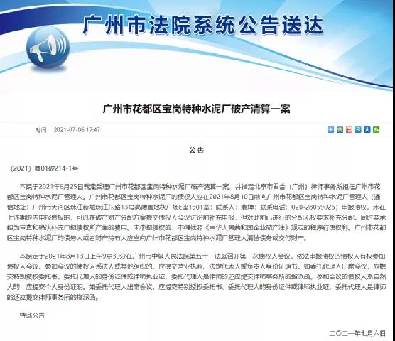 7月6日廣州市法院發(fā)布公告稱(chēng)已于6月25日裁定受理廣州市花都區(qū)寶崗特種水泥廠破產(chǎn)清算一案,并指定北京市君合(廣州)律師事務(wù)所擔(dān)任廣州市花都區(qū)寶崗特種水泥廠管理人。債權(quán)人需在8月10日前向廣州市花都區(qū)寶崗特種水泥廠管理人申報(bào)債權(quán)。