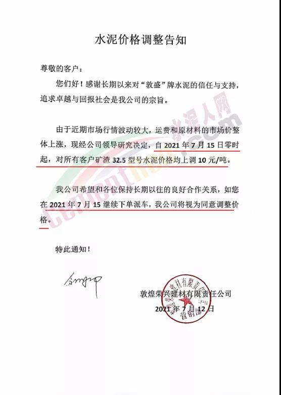 日前敦煌榮興建材有限責(zé)任公司通知由于近期市場行情波動較大,運費和原材料的市場價整體上漲,經(jīng)公司研究決定自7月15日零時起對所有客戶礦渣32.5型號水泥價格上調(diào)10元/噸。如客戶在調(diào)價后繼續(xù)下單派車,公司將視為同意調(diào)整價格。